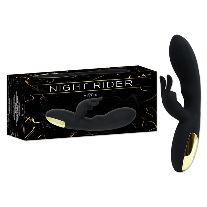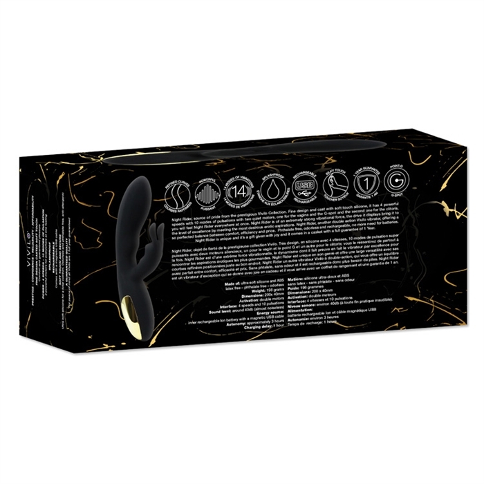 Night Rider, source of pride from the prestigious Vivilo Collection. Fine design and cast with soft touch silicone, it has 4 powerful speeds with 10 modes of pulsations with two quiet motors, one for the vagina and the G-spot and the second one for the clitoris, you will feel Night Rider everywhere at once. Night Rider is of an extremely strong vibrational force, the drive it displays bring it to the level of excellence by meeting the most desirous erotic aspirations. Night Rider, another double action Vivilo vibrator, offering a so perfected balance between comfort, efficiency and price. Phthalate free, odorless and rechargeable, no more need for batteries. Night Rider is unique and it?s a gift given with joy and it comes in a casket with a full guarantee of 1 Year. FINE DESIGN CASTED SOFT TOUCH Comfort and guaranteed pleasure POWER - 4 SPEEDS ? 10 MODES OF PULSATION 2 powerful motors for everywhere at one feeling RECHARGEABLE Comes with a magnetic USB cable SPLASH-PROOF SOFT TOUCH AND SECURE Ultra soft silicone for a total comfort. Odorless and phthalate free, anti-allergenic A GUARANTEED QUALITY For peace of mind all Vivilo are 1 full year guaranteed Made of: ultra-soft silicone ? latex free ? phthalate free ? odorless Finish: silicone and steel Weight: 198 grams Dimensions: 200x 40mm Activation: double motors Interface: 4 speeds and 10 pulsations Sound level: around 40db (almost noiseless) Energy source: inner rechargeable Ion battery with a magnetic USB cable Autonomy: approximately 3 hours Charging delay: 1 hour Vivilo? Prestige ? Confidence ? Reliability ? Affordability