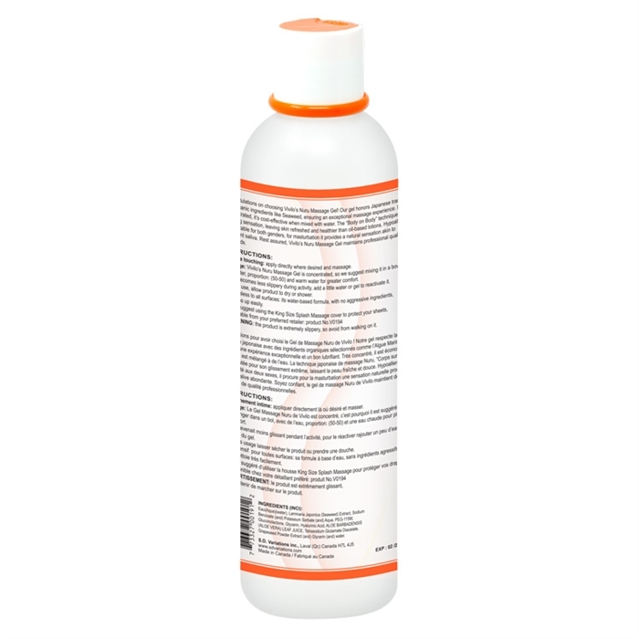 We label our Massage Gel as the 'Couple's Party', likening it to an 'Adult Slip 'n Slide'! Crafted from various organic ingredients, its secret lies in the premium-quality Japanese Marine Algae, skillfully prepared in strict Japanese tradition. Whether for massage or as a lubricant, Vivilo's Nuru Massage Gel guarantees the massage of your dreams and exceptionally slippery lubrication, as authentic as nature can be, and excellent for your skin.