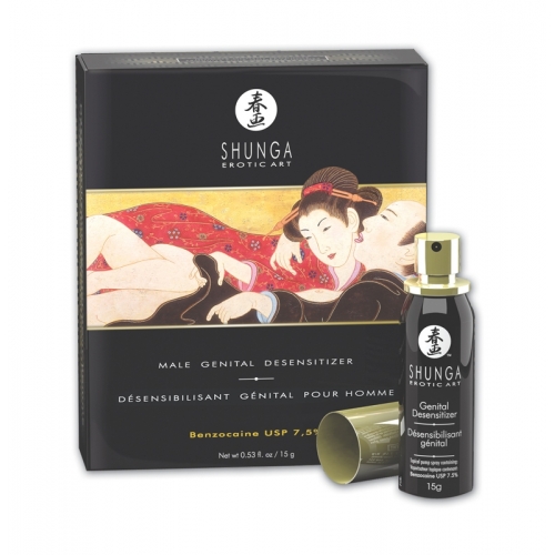 Désensibilisant pour hommes SHUNGA / Ce désensibilisant à base de benzocaine a été conçu pour aider l'homme à atteindre le plein contrôle de sa vie sexuelle. Cette formule innovatrice offre plus de sensations, plus de plaisir et un résultat durable grâce à un cycle de désensibilisation graduel. Vaporisateur topique avec agréable saveur fruitée.